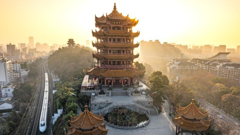 Huanghelou w Wuhan skąpana w ciepłym porannym świetle