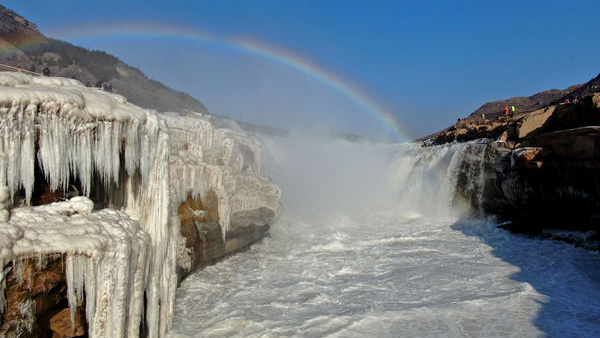 Na Wodospadzie Hukou na Żółtej Rzece pojawił się widok jakby „lodowego wodospadu w jadeitowym dzbanie”